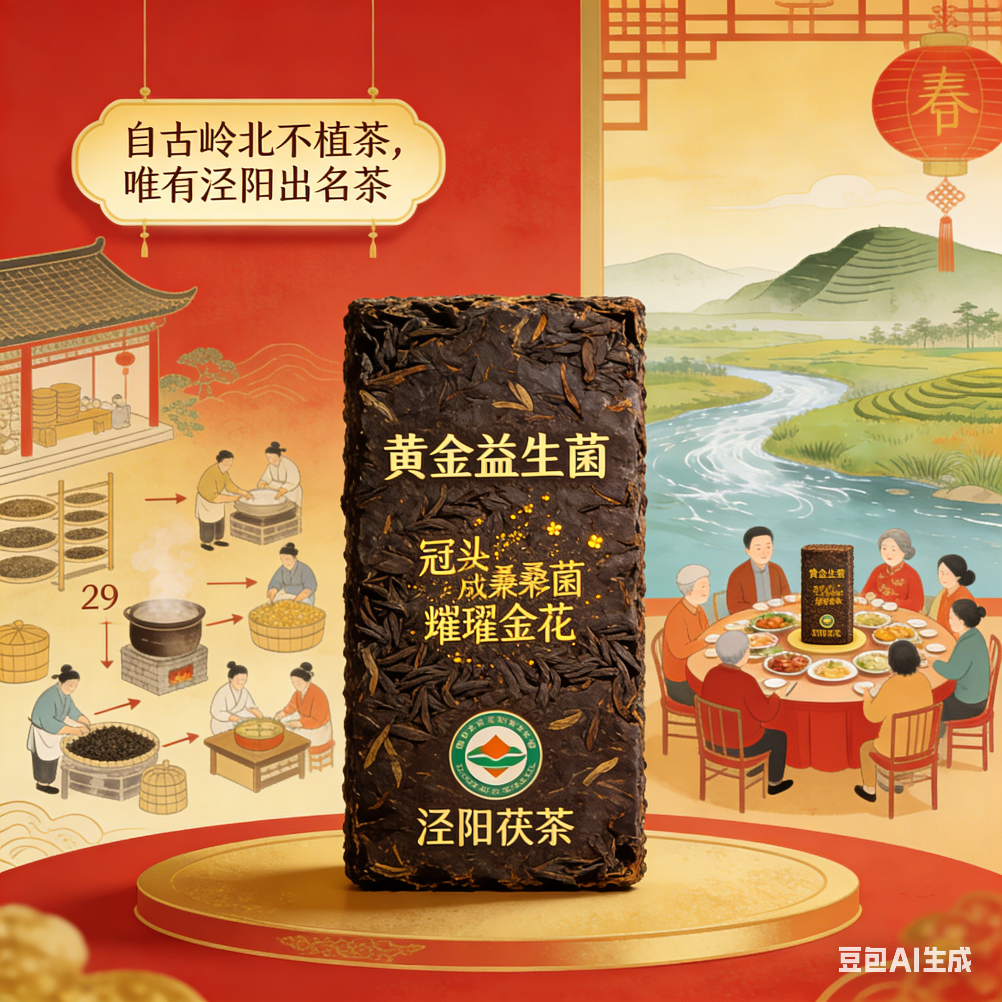 "自古岭北不植茶,唯有泾阳出名茶",这句流传千年的民谣,道出了泾阳茯茶独一无二的传奇身世。每至春节,承载着千年丝路文明的泾阳茯茶,总会准时出现在千家万户的团圆桌上,化作最温暖的年味注脚。作为国家地理标志保护产品,它沿袭 29 道古法工艺,在泾阳特有的湿地气候滋养下,汲取弱碱性泾水的灵性,最终催生出被誉为 "黄金益生菌" 的冠突散囊菌 —— 这层璀璨金花,不仅是大自然的神奇馈赠,更是三秦儿女代代传承的匠心印记,承载着最醇厚的故乡味道。